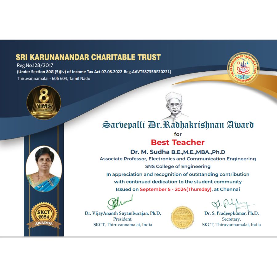 - Dr.M.Sudha ASP/ECE received Sarvepalli Dr Radhakrishnan Award for "Best Teacher" from SRI KARUNANANDAR CHARITABLE TRUST on 5th September 2024.